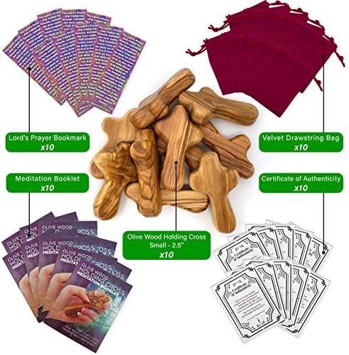 Certified Holy Land Olive Wood Handheld Comfort Cross from Israel. Small, 2.75″. Velvet Bag, Meditation Booklet, Lord’s Prayer Bookmark and Certificate of Authenticity Included. Clinging Palm cross