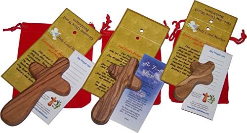 Holy Land Market Three Olive Wood Comfort Handheld Crosses with Velvet Bags & Lord’s Prayer Cards – Set of Three Sizes