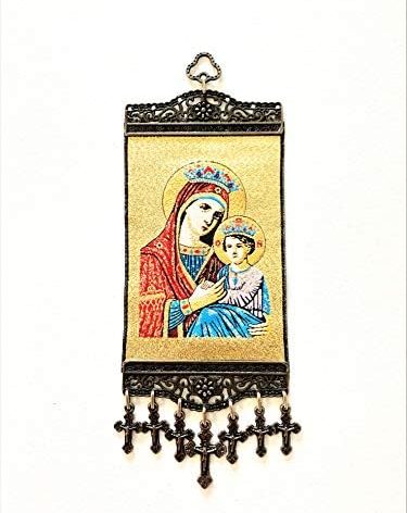 Religious Icon, Holy Saint Mary Blessed Virgin, Our Lady of Light, Woven Tapestry Icon With Metal Crosses Featuring Jesus Christ, Perfect Home Decor for Entire House or Office Spaces.