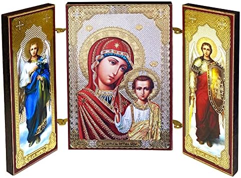 Virgin Mary Virgin of Kazan Icon Triptych With Archangels Saint Gabriel and Michael 3 3/8 Inch, Orthodox Icon Russian Saint, Religious Gift