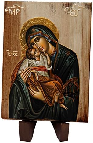 Wooden Greek Orthodox Icon of Mother of Jesus WIDTH: 15 CM 5.9 in LENGTH: 22 CM 8.66 in Our icons are made of the highest quality silkscreen on specially treated wood with advanced aging techniques and other quality materials that ensure the waterproofing and protection from solar radiation. All the icons are unique and original, in high quality made by hand after your order. Note: The wooden base in not included