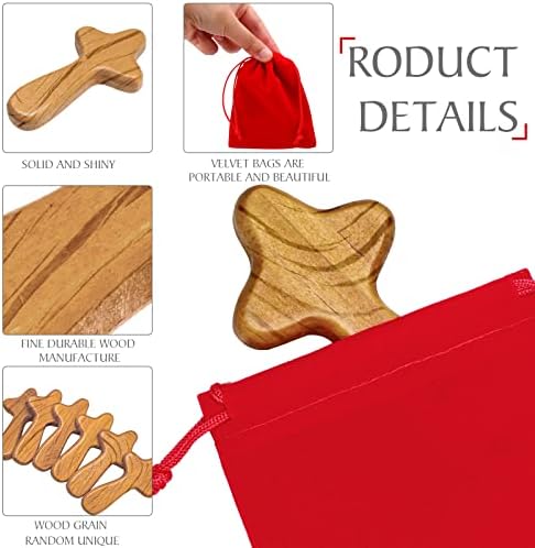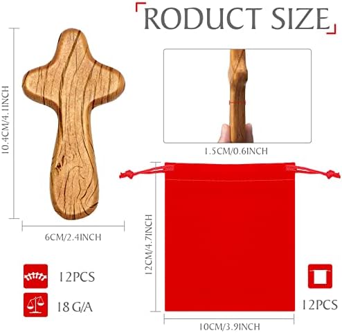 Comfortable to Hold: the wooden pocket crosses are measured about 4.1 x 2.4 x 0.6 inches/ 10.4 x 6 x 1.5 cm, can fit the palm of your hand, you can hold comfortably during prayer, and easily carry around with you; The velvet bag is about 3.94 x 4.72 inches/ 10 x 12 cm, the cross can be put in the bag for storing