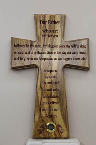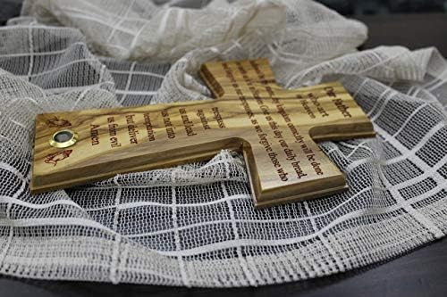 The Lord’s Prayer Wall Cross Olive wood Handmade in Bethlehem and Jerusalem the Holy Land, One of a Kind very Special with olive leaves laser prints for Home, Office and churches