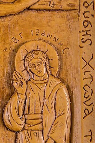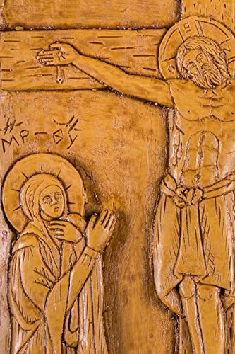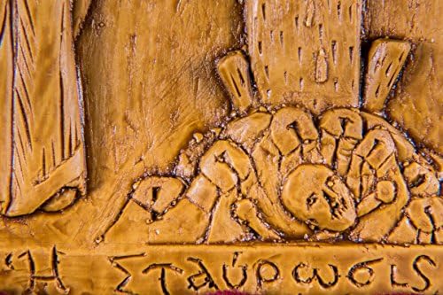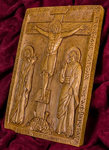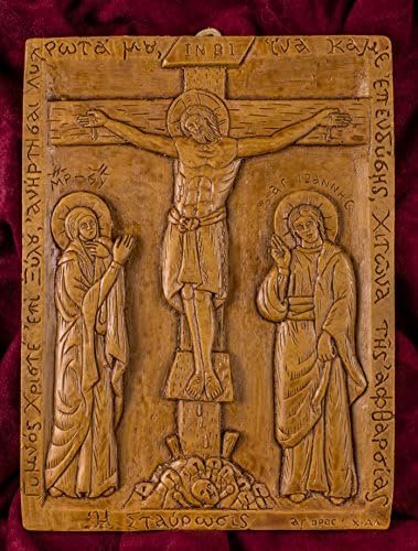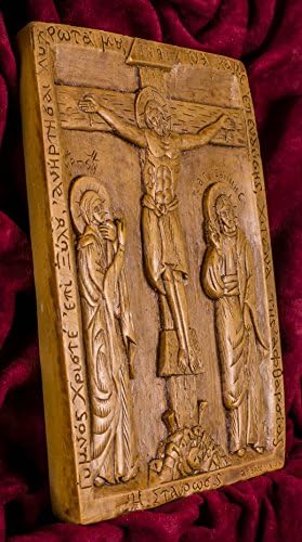 High quality icon/plaque crafted in a unique way with superior natural materials. Traditional icon of The Crucifixion with the Virgin and Saint John | 13cm x 17cm (5.11inches x 6.69inches) item id. #200 | Made with pure beeswax, mastic and incense exactly like the first Christian icons of Luke the Evangelist. No other materials or chemicals of any sorts are used. Hand-carved, solid beeswax with great emphasis on detail It emits a very distinct odor due to the incense from Mount Athos creating an atmosphere similar to an Orthodox church or to a Monastery. We really wish we could transmit this pleasant odor over the internet for you to smell! No one else make them like this today! This is a truly unique item, the perfect spiritual gift for your Christian friend or for your own prayer corner