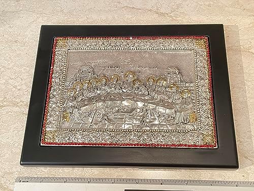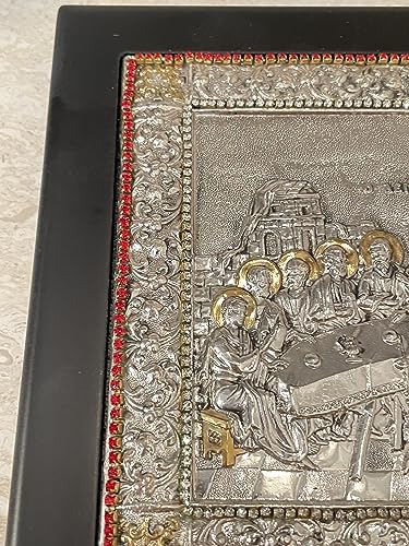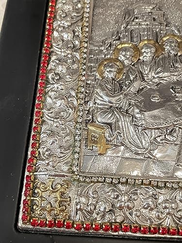 Vintage Last Supper Solid Sterling Silver 925 Christian Icon Handset with 408 Gems Hallmarked 9″x7″ Last Supper Vintage Hallmarked Christian ICON SOLID Sterling SILVER 925 Orthodox Christianity gift HANDMADE By Master Silver Smiths Hand Carved Handpainted with 24k GOLD HANDSET 408 Austrian Crystal Gem DIAMONDS & RUBIES HANDSET. LAST SUPPER ICON. Christian Blessing gift for someone special in your life. Hand carved Hand painted by Master Silver Smiths Byzantine Greek Russian Orthodox Religious Christianity 9″x7″ (23cm x 17cm) HANDMADE Solid Silver Christian Icon ANTIQUE VINTAGE Checked , Stamped and Approved by the Cyprus Government European Union Assay Office. Religious Home Decor Greek Russian Orthodox Sterling Silver Icon Handpainted Lord Jesus Christ Christening. Communion, Wedding, Baptism, Engagement,birthday , anniversary, Christmas, Easter, New home owners Christian gift. A religious icon is a symbolic gift and is meant as are a form of blessing and prayer. It is meant to make you aware that you are in the presence of God’s love, His blessings ,the love of Christ and His Saints and Angels. Christ dwells in us by His grace, and the Saints and Angels are already present with us, through their love and their prayers; the icon reminds us, and makes us aware of that presence. Truly a Holy and symbolic Christian gift.