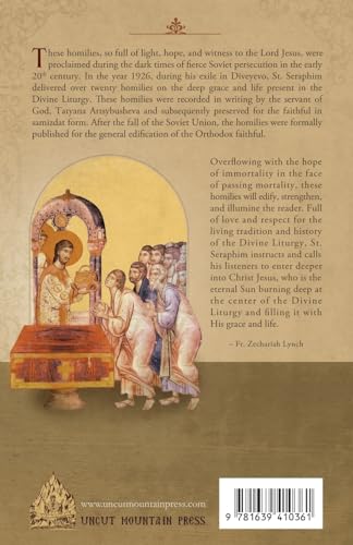 These homilies, so full of light, hope, and witness to the Lord Jesus, were proclaimed during the dark times of fierce Soviet persecution in the early 20th century. In the year 1926, during his exile in Diveyevo, St. Seraphim delivered over twenty homilies on the deep grace and life present in the Divine Liturgy. These homilies were recorded in writing by the servant of God, Tatyana Artsybusheva and subsequently preserved for the faithful in samizdat form. After the fall of the Soviet Union, the homilies were formally published for the general edification of the Orthodox faithful. Overflowing with the hope of immortality in the face of passing mortality, these sermons will edify, strengthen, and illumine the reader. Full of love and respect for the living tradition and history of the Divine Liturgy, St. Seraphim instructs and calls his listeners to enter deeper into Christ Jesus, who is the eternal Sun burning deep at the center of the Divine Liturgy and filling it with His grace and life. Overflowing with the hope of immortality in the face of passing mortality, these homilies will edify, strengthen, and illumine the reader. Full of love and respect for the living tradition and history of the Divine Liturgy, St. Seraphim instructs and calls his listeners to enter deeper into Christ Jesus, who is the eternal Sun burning deep at the center of the Divine Liturgy and filling it with His grace and life. – Fr. Zechariah Lynch