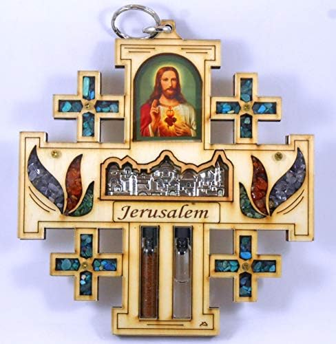 Jesus pray Icon on Cross of Jerusalem shape with walls of Jerusalem made from pewter;2 Bottles;1 with pure holy water from Jordan River and the second with genuine Earth from Jerusalem, Made by Matiel Ltd. Medium size