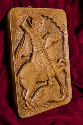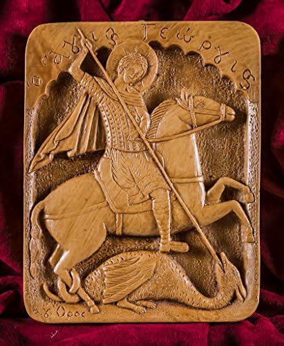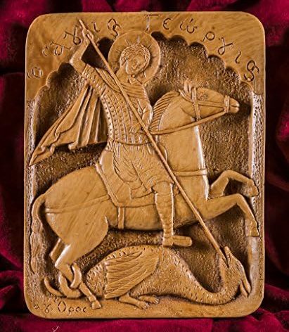 Saint George Georgios Killing the Dragon Hand-carved Aromatic Christian Orthodox Icon Plaque Made with Pure Beeswax, Mastic and Incense From Mount Athos