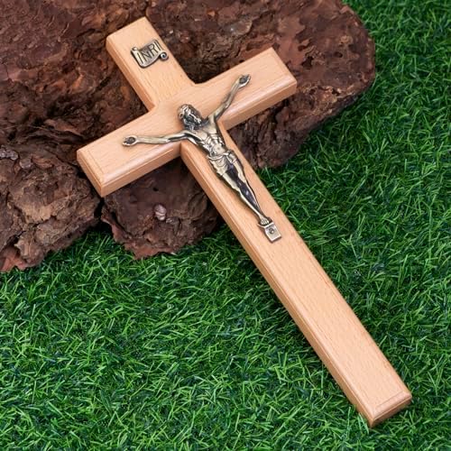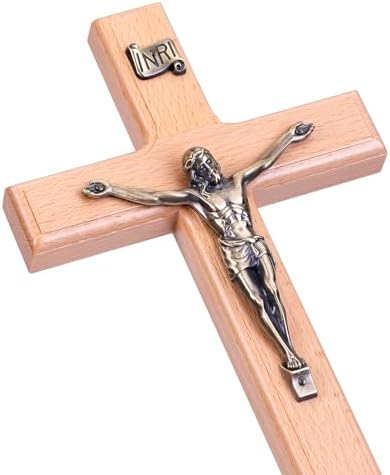 DETAIL CRAFTSMANSHIP: This crucifix wall cross features a beautifully detailed bronze-colored metal Jesus Christ corpus and INRI, securely attached to a smoothly varnished wooden cross. The contrast between the natural wood and the metallic Jesus creates a timeless and elegant design that complements any decor.