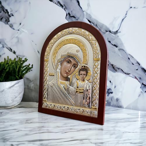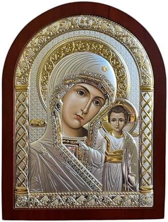Silver Canvas (A-3/002G/K) Virgin Mary of Kazan Kazanskaya Byzantine Silver Orthodox Icon/Greek Handmade (Red, 5 1/2×4)