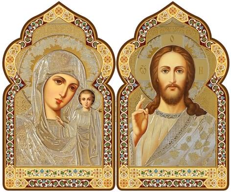 Christ The Teacher and Virgin of Kazan Catholic Orthodox Icon Diptych for Travel Home Display- Orthodox Wedding Gift Icon Set – Home Decoration – Image of Jesus Christ The Teacher and Virgin of Kazan Orthodox Icon Diptych, Virgin Mary and Christ, Gold Foil Icons – This Church Dome Shape Orthodox Catholic Icon Diptych is a beautiful and compact representation of faith. Featuring the revered icons of the Virgin of Kazan and Christ The Teacher, this diptych is crafted in a traditional Byzantine style. It is perfect for both travel and home display. The diptych is elegantly decorated with gold foil crosses and intricate ornamentation on the back and sides, adding a touch of sophistication.