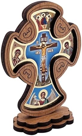 This wooden standing cross is adorned with deeply symbolic religious figures, featuring the Holy Trinity at the pinnacle, a detailed Crucifixion scene with the Virgin Mary and St. John the Beloved at the center, and a Guardian Angel with a three-bar cross at the base. Crafted with precision in Ukraine, the cross showcases the rich heritage and artistry of its makers. It stands at a modest 3 1/16 x 2 ¼ inches, an ideal size for a variety of spaces, from a church altar to a home prayer corner. The intricate detailing on each icon segment is a testament to the care and reverence poured into its creation. This cross is more than just a piece of decor; it is a versatile emblem of faith, suited to adding a spiritual dimension to any environment.
