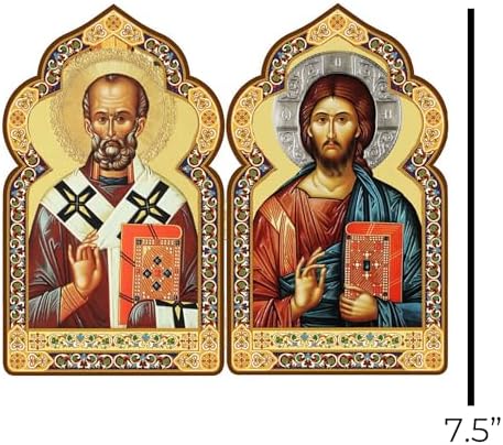 Saint St Nicholas Russian Orthodox Icon Diptych With Icon image of Jesus Christ. This Church Dome Shape Orthodox Diptych is a beautiful and compact display of faith. Featuring the revered icons of Jesus Christ the Teacher and Saint Nicholas, this diptych is designed in the traditional Byzantine style. It is perfect for both travel and home display. The diptych is elegantly decorated with gold foil crosses and intricate ornamentation on the back and sides, adding a touch of sophistication. Lightweight and portable, this diptych is ideal for those who wish to carry a piece of their faith with them. It is packed in a white box, making it a thoughtful gift for any religious occasion. Embrace the beauty of Orthodox Christian art with this exquisite diptych.