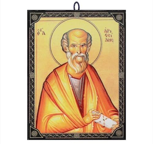 This wooden icon features a beautiful depiction of a Saint Aristeid in Byzantine style.
