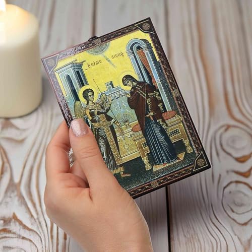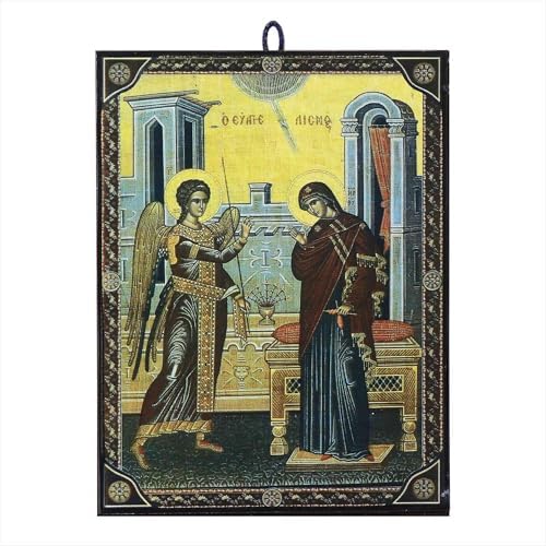Inspired by Greek and Byzantine icons, this Annunciation of the Virgin Mary is made of MDF wood board and offers a meaningful representation of religious kuns