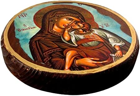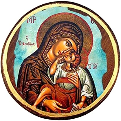 Round Hand Carved Wooden Greek Orthodox Icon of Virgin Mary & Jesus Christ
