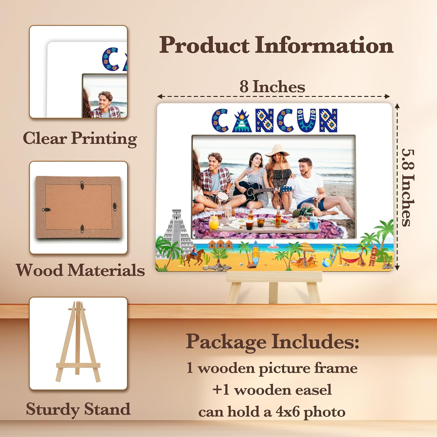 Cancun Picture Frame, Beach Picture Frame, Travel Cancun Gifts, Honeymoon Vacation, Wedding Picture Frame In Cancun, Wood 4×6 Photo Frame for Desk Display-A07