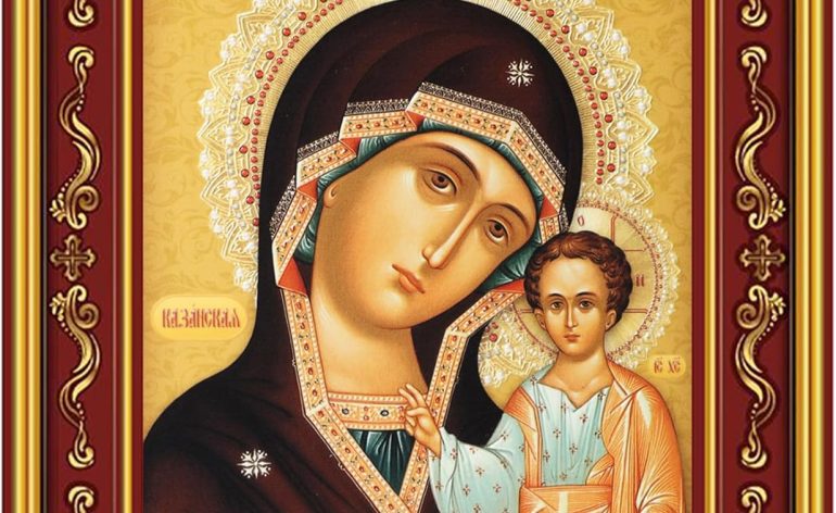 Virgin Of Kazan and Christ Child – Wooden – Gold Foiled Icon Beautifully Framed in Burgundy Wodden Frame Decorated With Crosses
