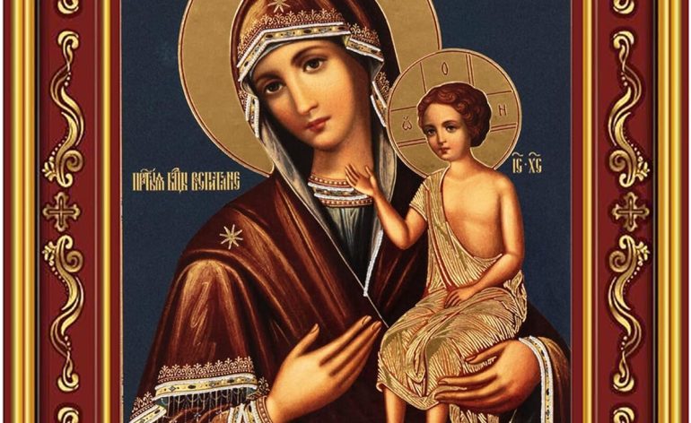 Virgin Mary Icon Orthodox Christian Mother of God Nurturer of Children, Upbringing Educator – She nurtures us by providing sustenance to us all in the form of her Son, Jesus Christ, and also by her intercessions on our behalf – Mother of God Nurturer of Children refers to a prayer service in which one asks the Mother of God to raise a child to be worthy of Christ’s kingdom – Orthodox Christian Catholic Icon, Gold Foil Icon Framed in a Beautiful Burgundry Color Wooden Frame Decorated With Crosses
