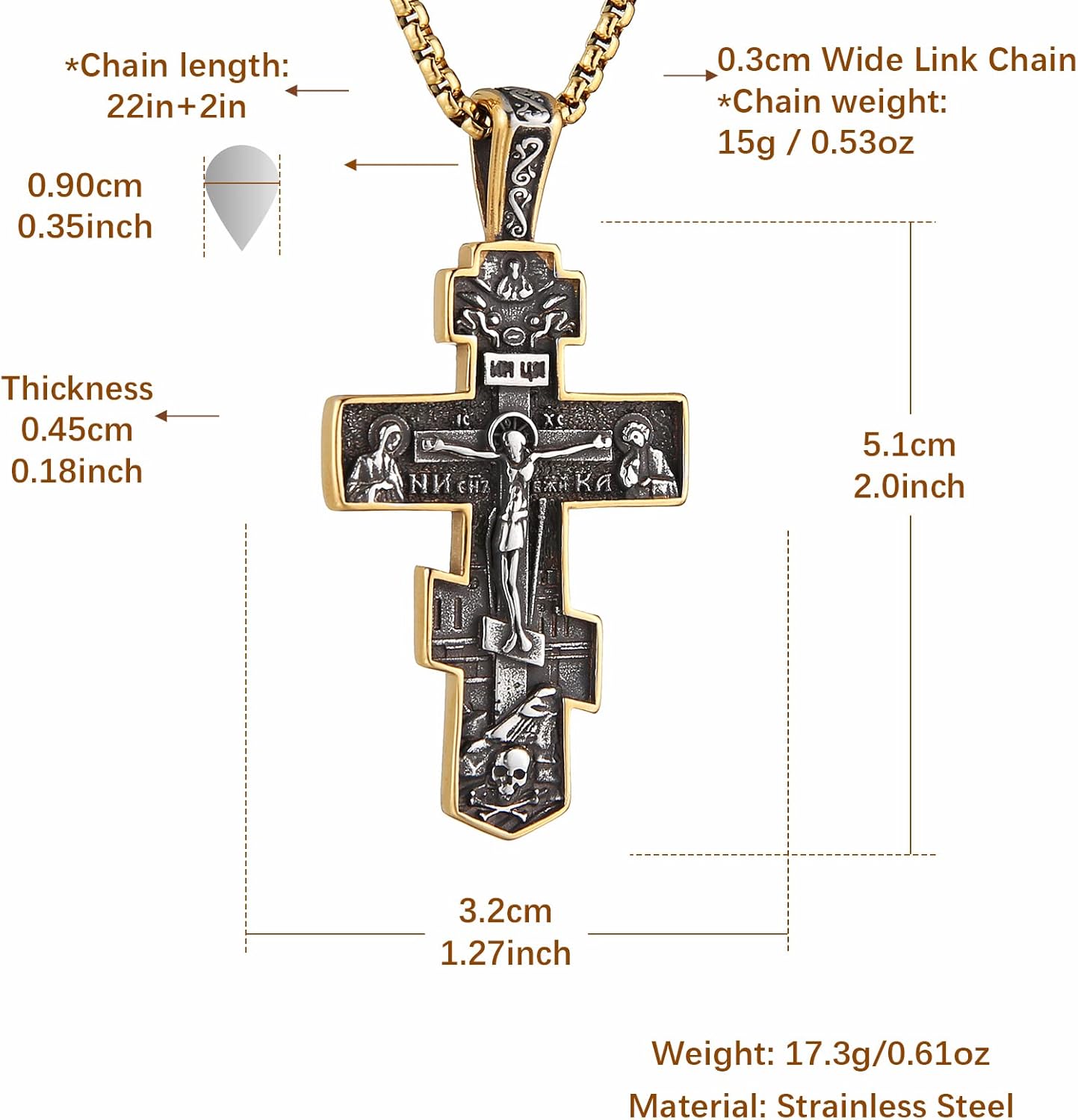 Unique Design: The classic retro Orthodox cross pendant is a double-sided design with a crucifix on the front and a carved Christian prayer on the back. The gilt outline gives the pendant a more stately lookMaterials: Made of high-quality stainless steel with a delicate pattern that does not fade, rust, deform, making this pendant durable and suitable for long wear without damaging the skinPendant Size: Pendant approx. 3.2 cm x 5.1 cm/1.27 “x 2.0”, Weight: 17.3g. It comes with a 22+2 inch stainless steel chain