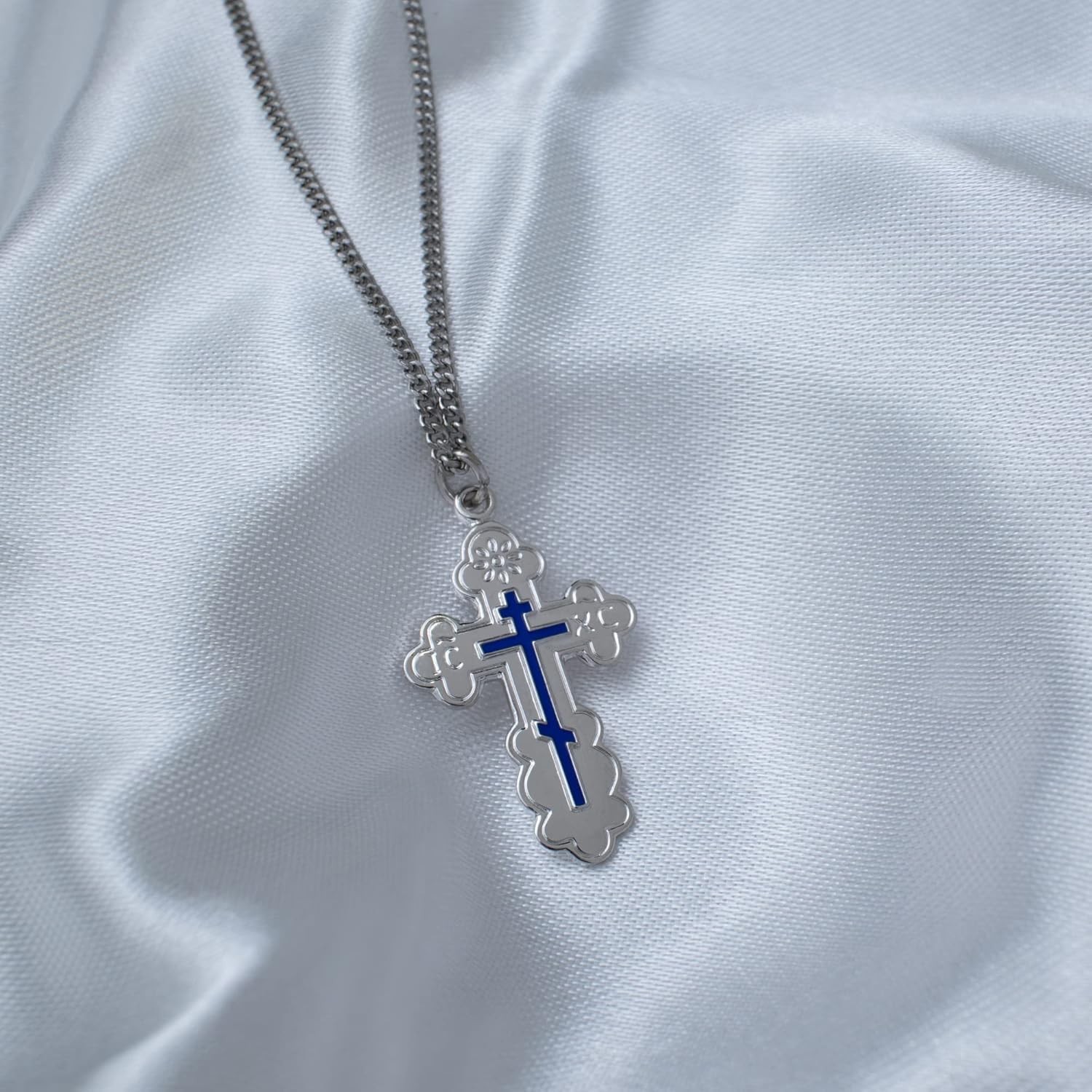 Eastern Orthodox Cross, Adult Baptism Gifts for Women, Sterling Silver with Blue Enamel and Stainless Steel Chain, 1 Inch Medal