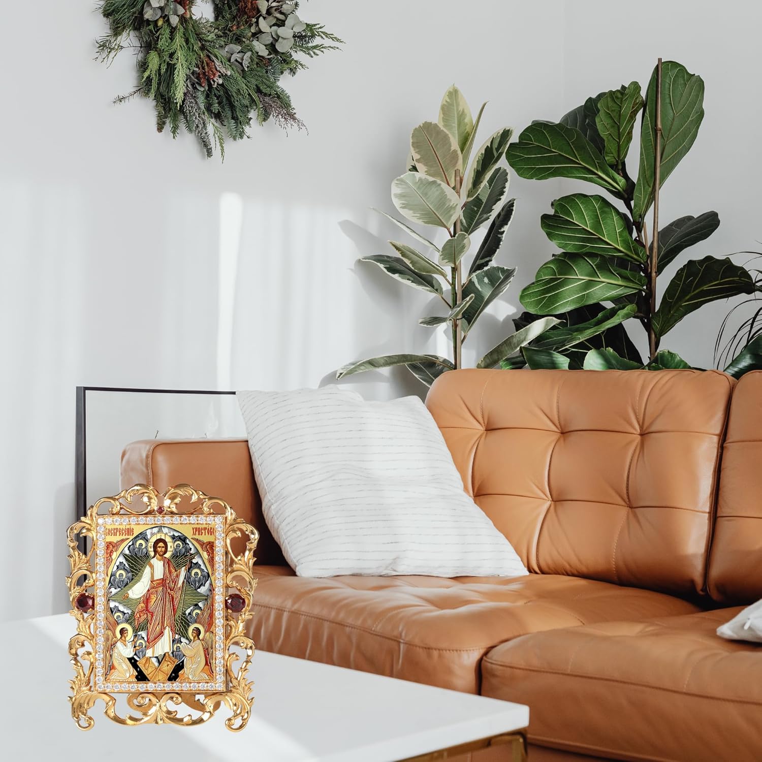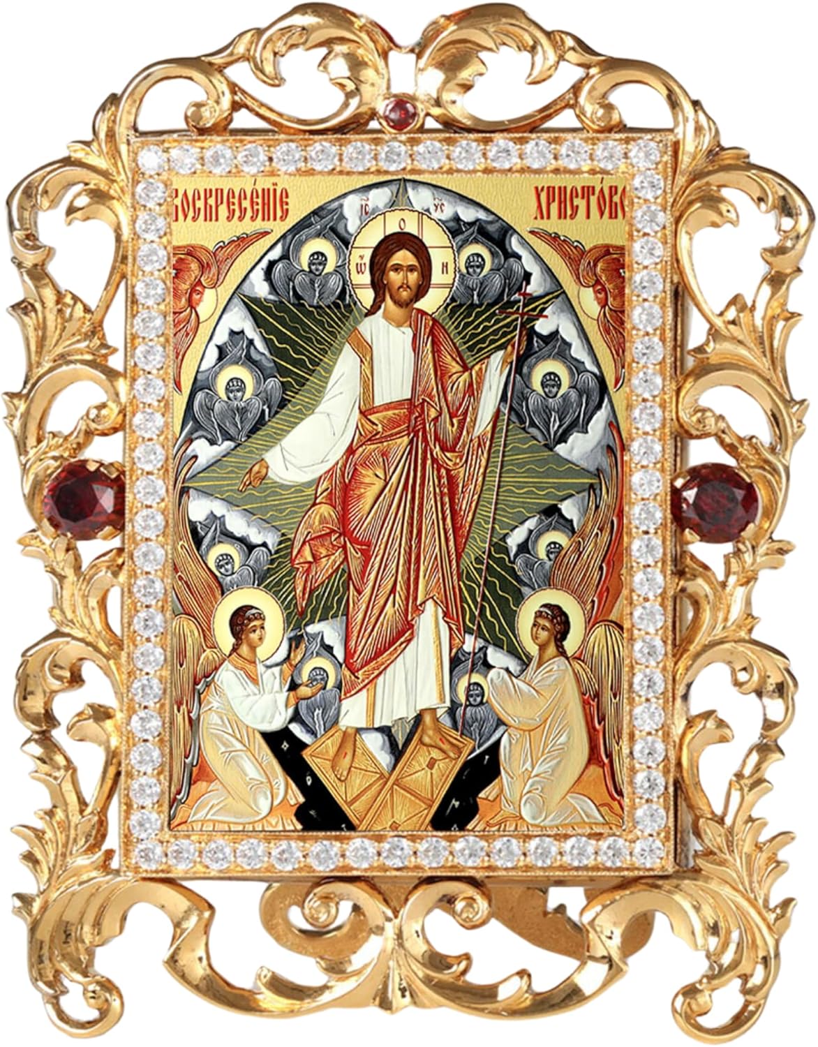 The Resurrection of Christ Orthodox Catholic Icon, featuring the depiction of Seraphim 6-Wing Angels, is set in an exquisitely detailed jeweled frame adorned with faux crystals. Made of durable metal, this icon includes a stand for standing display and a 2-inch chain for hanging, offering versatile display options. It comes beautifully gift boxed with a transparent top, making it ready for any occasion. Measuring 4 inches tall and 3 1/4 inches wide, this icon is an ideal gift for Christmas, Easter, birthdays, or any other meaningful celebration.