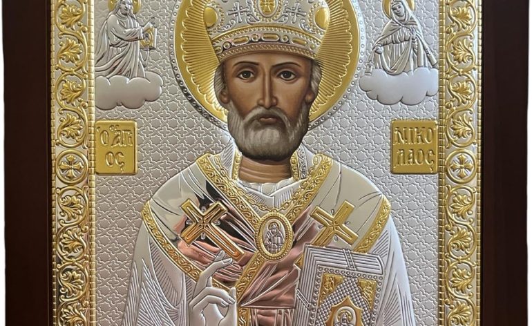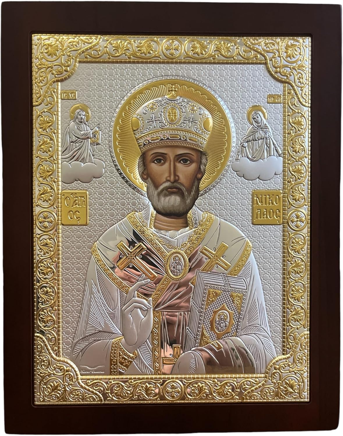 Silver Canvas (PR-5/003G/K) Saint Nicholas Byzantine Silver Orthodox Christian Icon/Greek Handmade (Red, 9 1/2 x 7 1/4)