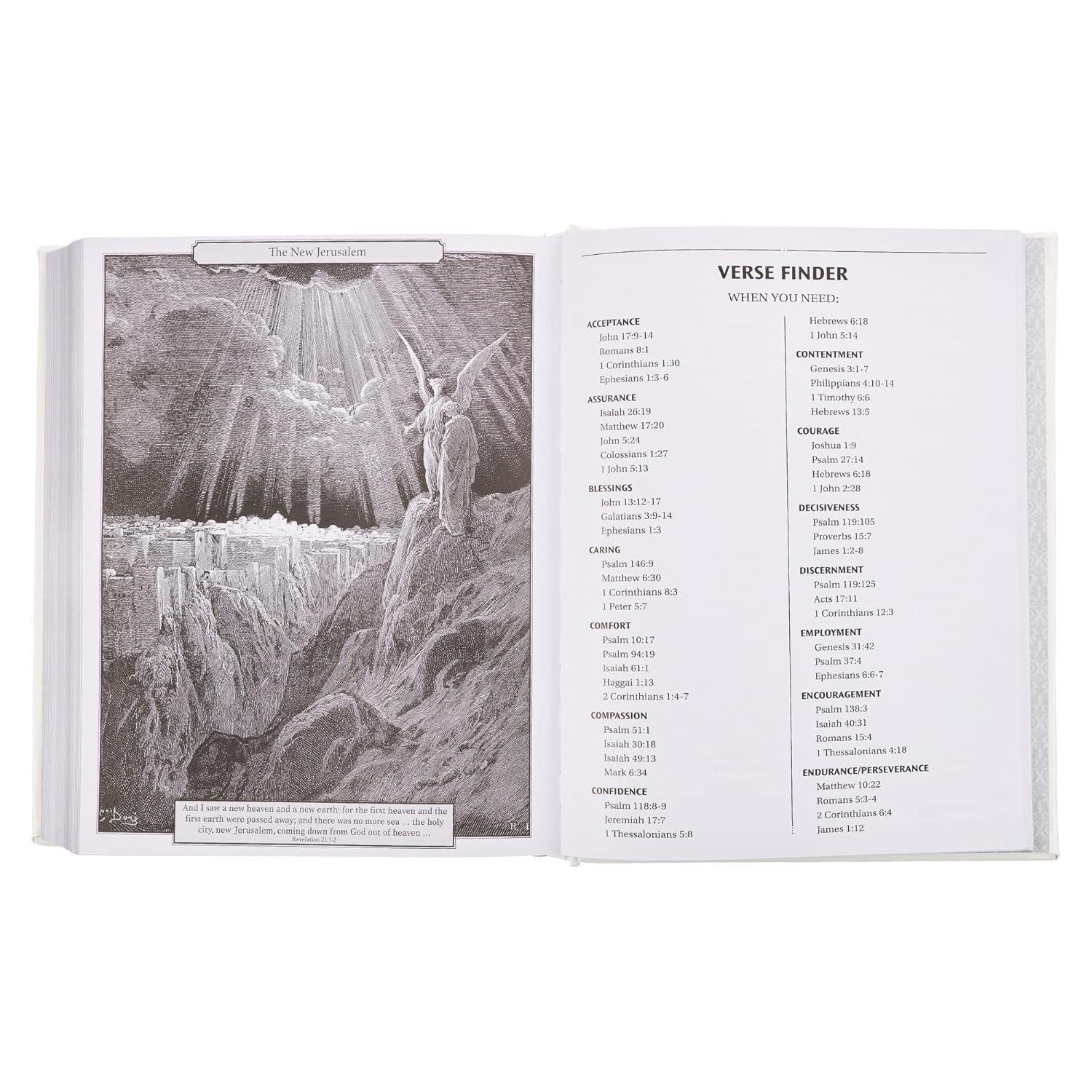 Inside the hardcover Bible, you will find the classic 1769 English King James Version text, a marriage certificate that can be signed at a wedding ceremony, family trees for a husband and a wife, a log for children and grandchildren, baptisms, and deaths.The Bible’s text includes reader-friendly subheadings, a double-column format, 66 beautifully matched, full-page black and white Gustave Doré illustrations, a thematic Scripture verse finder, and a one-year Bible reading plan.