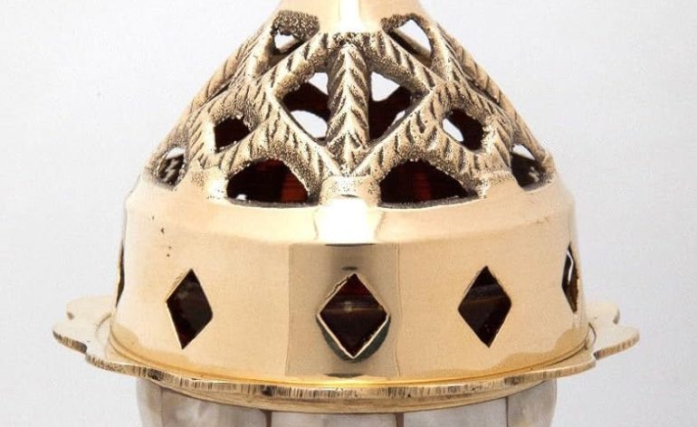 Christian Bronze table Oil Lamp with ivory Dimensions : 17 cm 6.7 in Description: The vigil lamp is a candle burning lamp that is placed before an icon as a reminder that Jesus Christ is the light of the world and illumines our souls. There are two basic types of vigil lamps: hanging and standing. Usually vigil lamps are lit using oil, usually olive oil, as the fuel feeding a floating wick. The vessel holding the oil is a cup usually made of heat treated glass. Sometime lamps that burn a wax, usually bee’s wax, candles are used. In Orthodox Christian usage, electric lamps are not used.