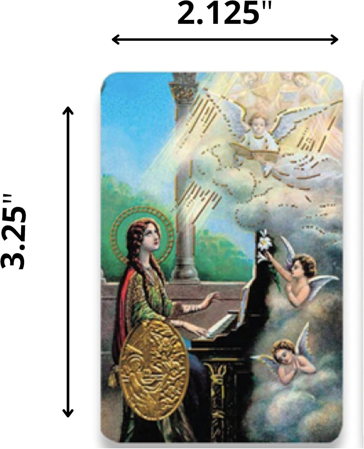 This St. Cecilia credit card-sized religious holy cards five-pack with embossed gold medallion, light plastic coating, and intercession prayer on the back makes great Catholic gifts for women and men. ALWAYS WITH YOU These 3.25″ x 2.125″ St. Cecilia Confirmation gifts have a clear plastic coating to protect the Catholic holy cards for years of service. Each card is exactly sized to fit readily into wallet or billfold driver’s license or credit card slots.