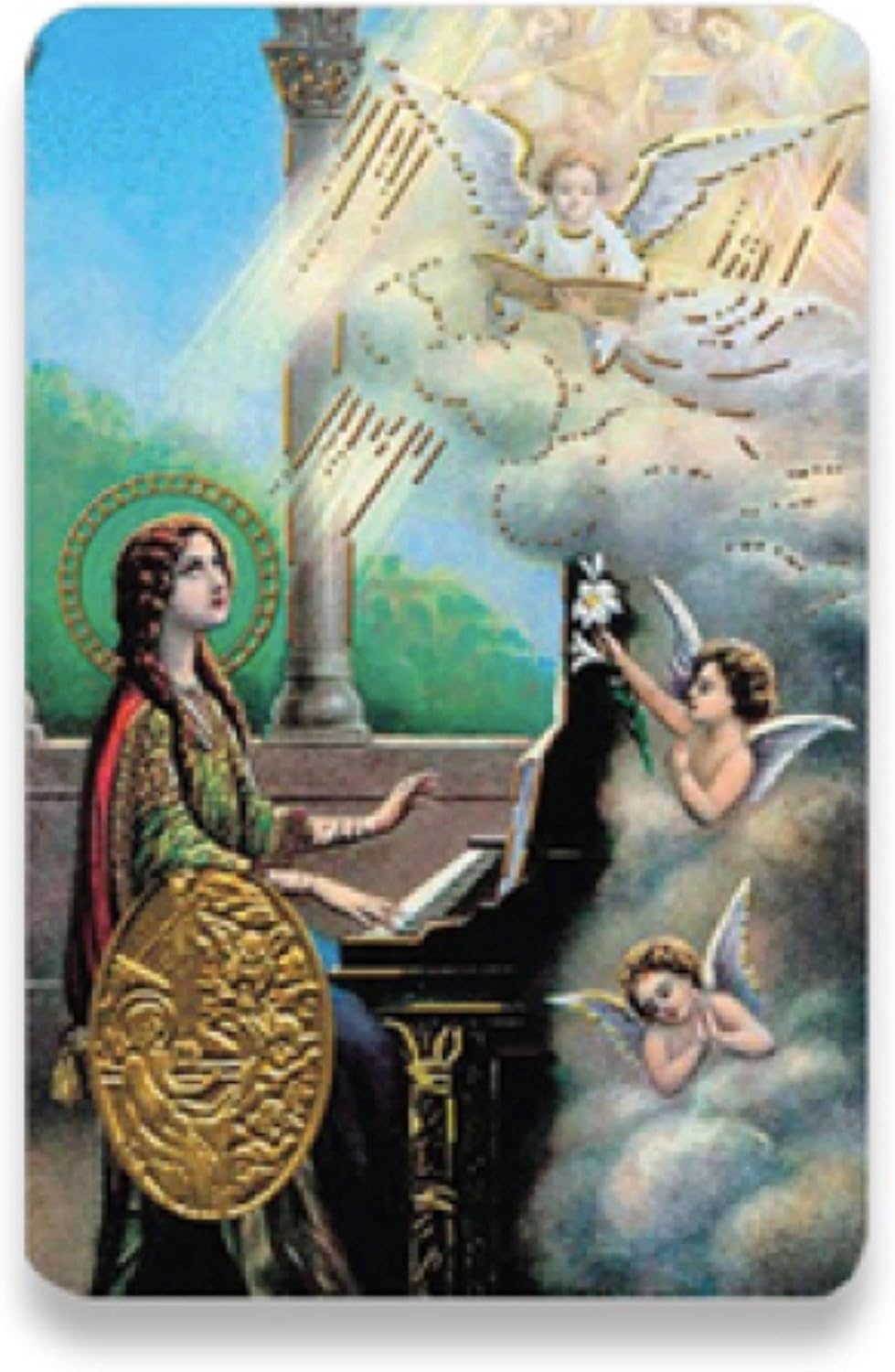 ALWAYS BEAUTIFUL These spiritual birthday gifts for women feature an exquisitely detailed full color picture that shows the Patron Saint of Musicians seeing at a keyboard with accompanying angels. The picture is highlighted by reflective gold accents. In the upper left of the picture, there is a .875″ embossed gold foil medallion with a replica of the main picture.