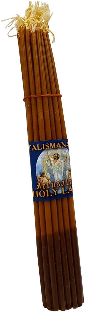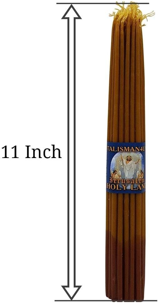 33 BEESWAX TAPER CANDLES 11″ Tall Church Jerusalem Holy Land Candles. Blessed in the Holy Sepulcher Church Jerusalem. These candles are handmade in Jerusalem by local Christian craftsman from beeswax. Pleasant scent beeswax candles, Holy Land prayer candles. Color: Yellow – Brown. Length: 28 cm / 11 inch. Weigh: approximately 190 g.