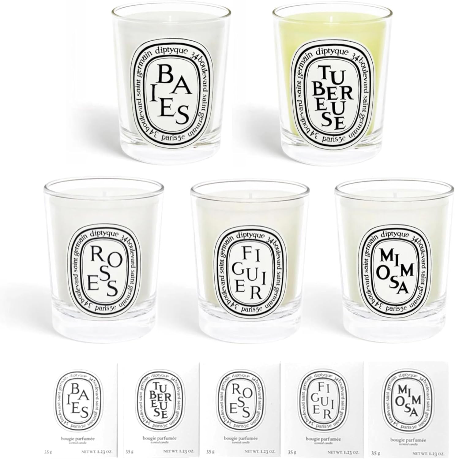 Diptyque Baies Roses Figuier Mimosa & Tubereuse 5 Piece Scented Candle Gift Set 35 Grams Each Limited Edition, White