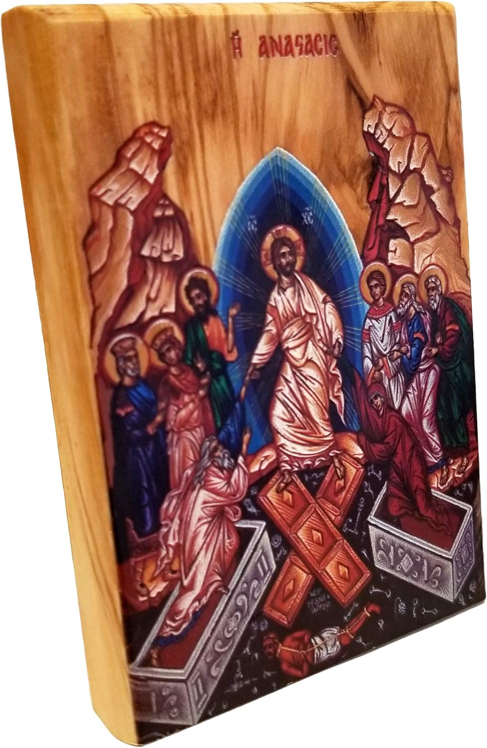 This beautiful, full color olive wood icon is a unique display of faith. Place it on a desk at work, a remembrance table at church, or a counter top at home; this icon will fit into any décor. Made in the Holy Land of Bethlehem.Pictured is a traditional Byzantine depiction of the Resurrection of Jesus.