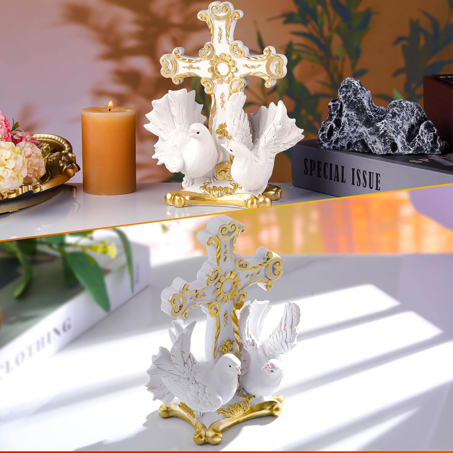 Wonderful Decorative Cross: This resin dove cross can be placed as a beautiful decoration in your home, such as, living room, display cabinet, mantelpiece, desk, bedside table, window sill, bookshelf and anywhere you want to decorate. No matter where it is placed, it is an eye catching presence.