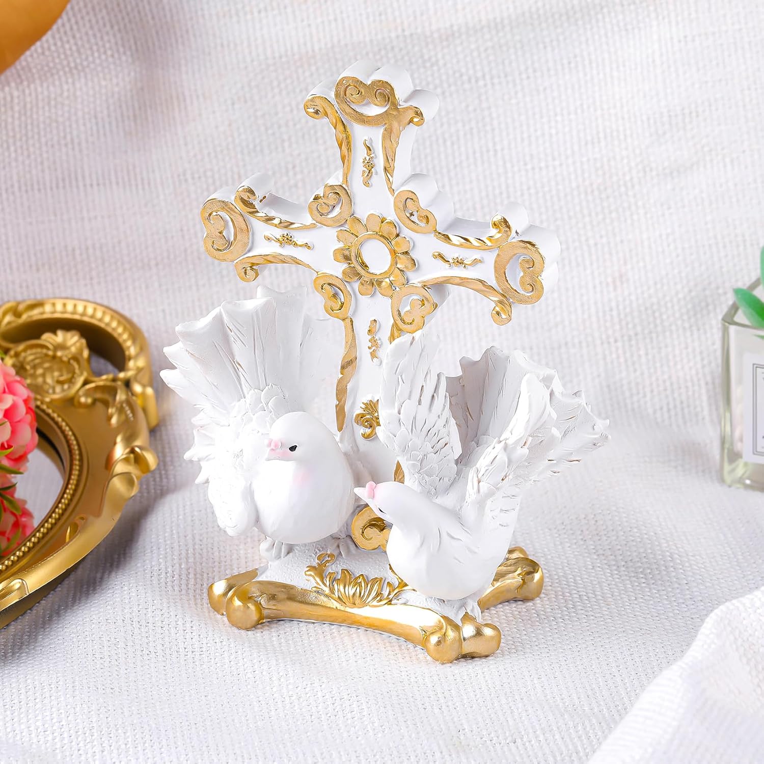 Quality Material: Doves birds table cross is constructed from quality resin, with robustness and lightweight characteristics, making it suitable for long term use; Lifelike appearance adds to the aesthetic appeal, and it is also odorless and unaffected by temperature variations.