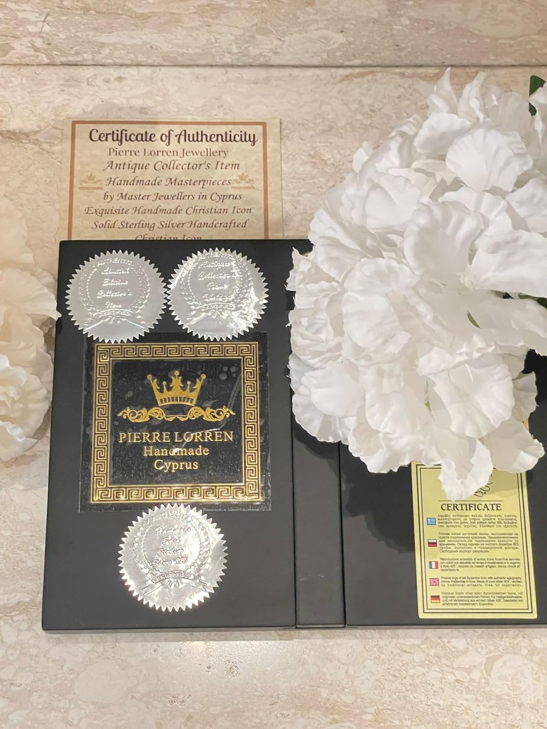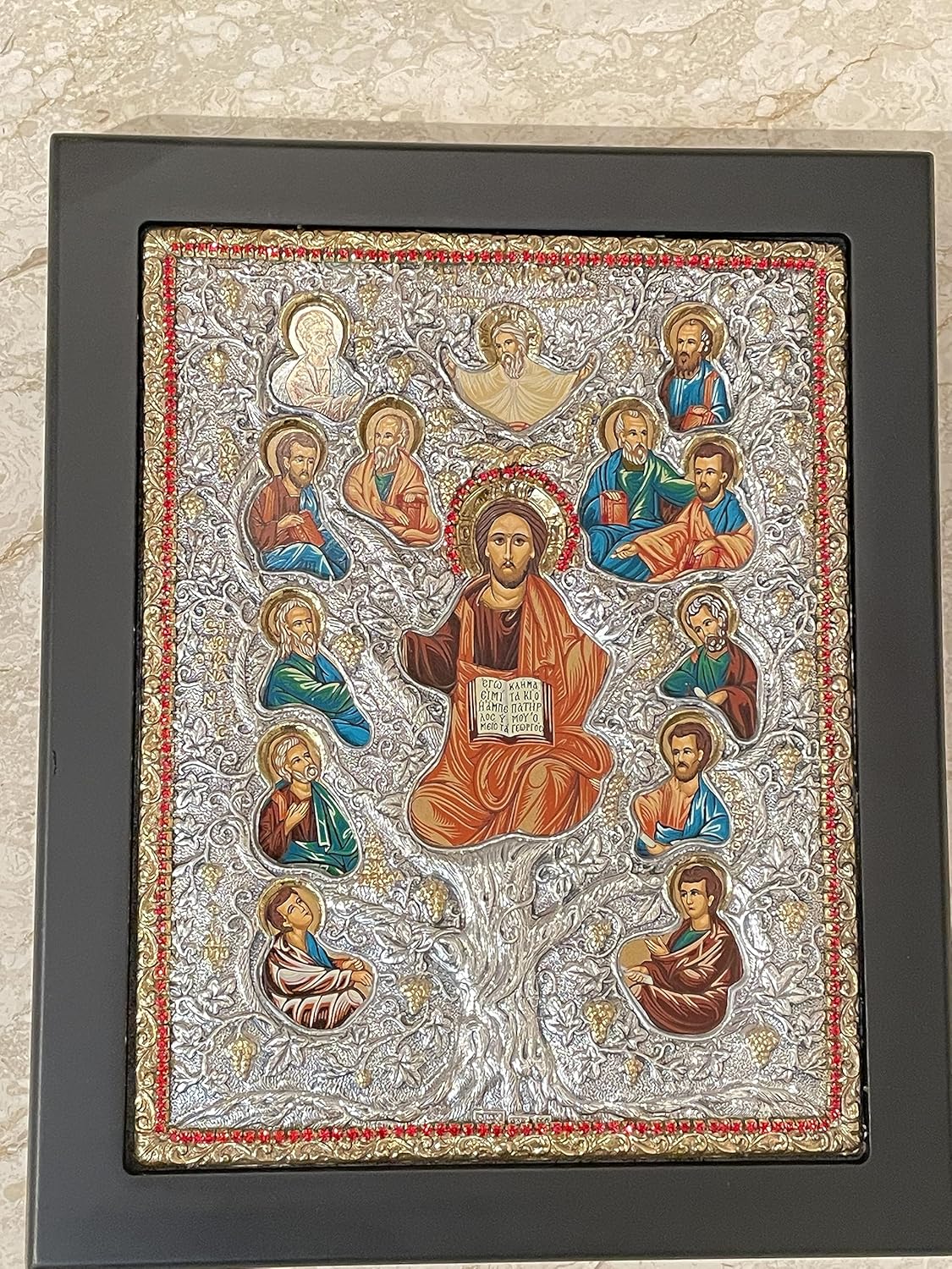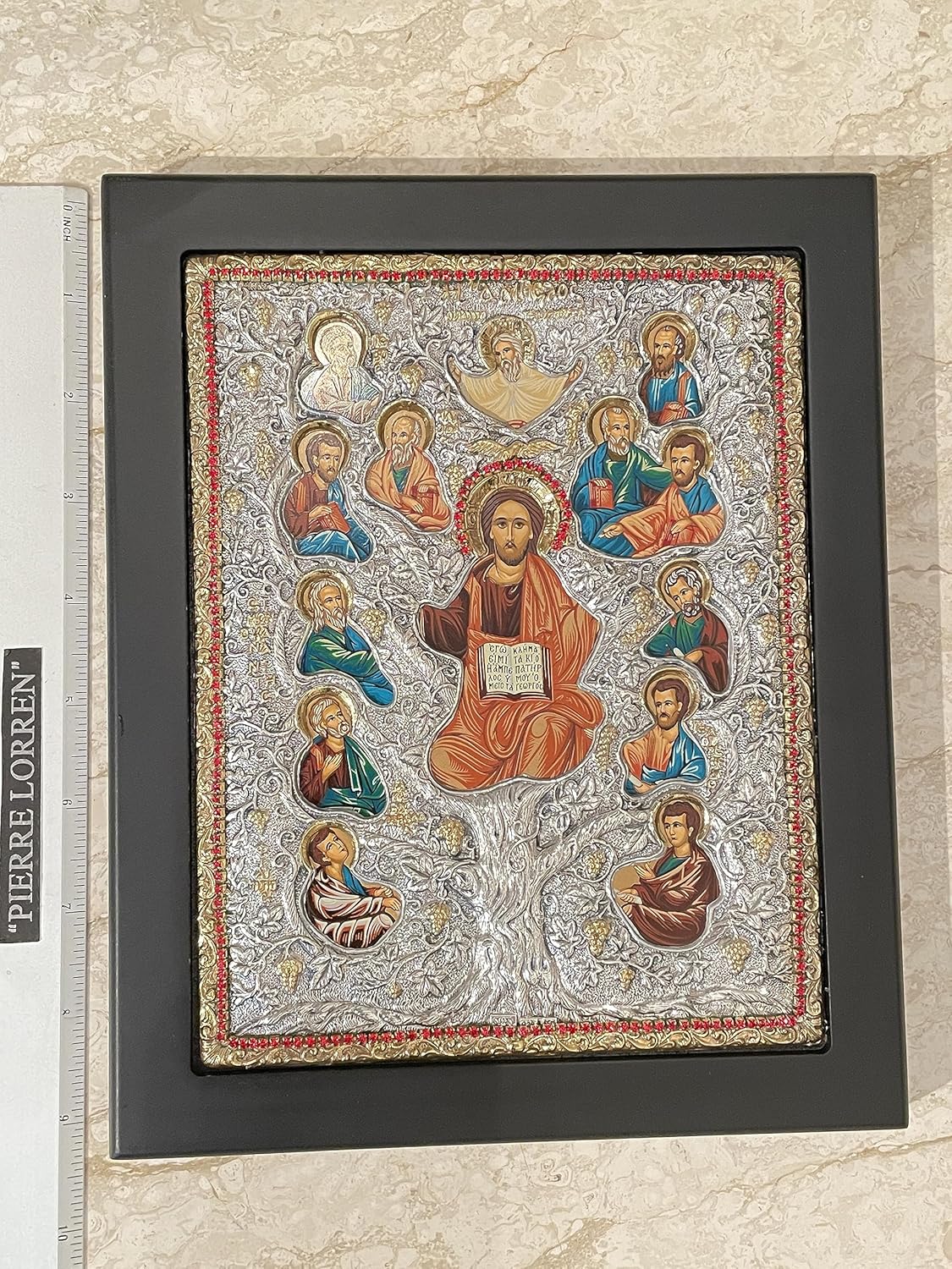 GOLD Vintage Byzantine Icon Tree of Life Jesus Christ Orthodox Christian the Twelve Apostles of Jesus Christ Icon SOLID Sterling Silver 925 Christian Icon Handset with 350 Gems Hallmarked 9″ x 6.5″ religious Christianity Home Decor Solid Sterling SILVER Icon Tree of Life Jesus Christ the Twelve Apostles Icon Vintage Hallmarked Christian ICON Russian Greek Orthodox Icon SOLID Sterling SILVER 925 Orthodox Christianity gift HANDMADE By Master Silver Smiths Hand Carved Handpainted with 24k GOLD HANDSET 350 Austrian Crystal Gem DIAMONDS & RUBIES HANDSET. Jesus Icon Orthodox. Christian Blessing gift for someone special in your life Russian Greek Orthodox Ampelos Tree of life Russian Icon Hand carved Hand painted by Master Silver Smiths Byzantine Greek Russian Orthodox Religious Christianity 9″ x 6.5″ (22.5 cm x 16.5cm) HANDMADE Solid Silver Christian Icon ANTIQUE VINTAGE Checked , Stamped and Approved by the Cyprus Government European Union Assay Office This famous Handmade The Tree of Life is the tree that grows within the Garden of Eden and is the source of eternal LIFE. The symbol of LOVE and humanity free from corruption and sin The tree is believed to have HEALING properties and its fruit grants IMMORTALITY. A true blessing for any Christian home to have A religious icon is a symbolic gift and is meant as are a form of blessing and prayer. It is meant to make you aware that you are in the presence of God’s love, His blessings ,The love of Christ & His Saints the power of prayer for us to overcome our difficulties. A symbolic gift of love to any Christian .