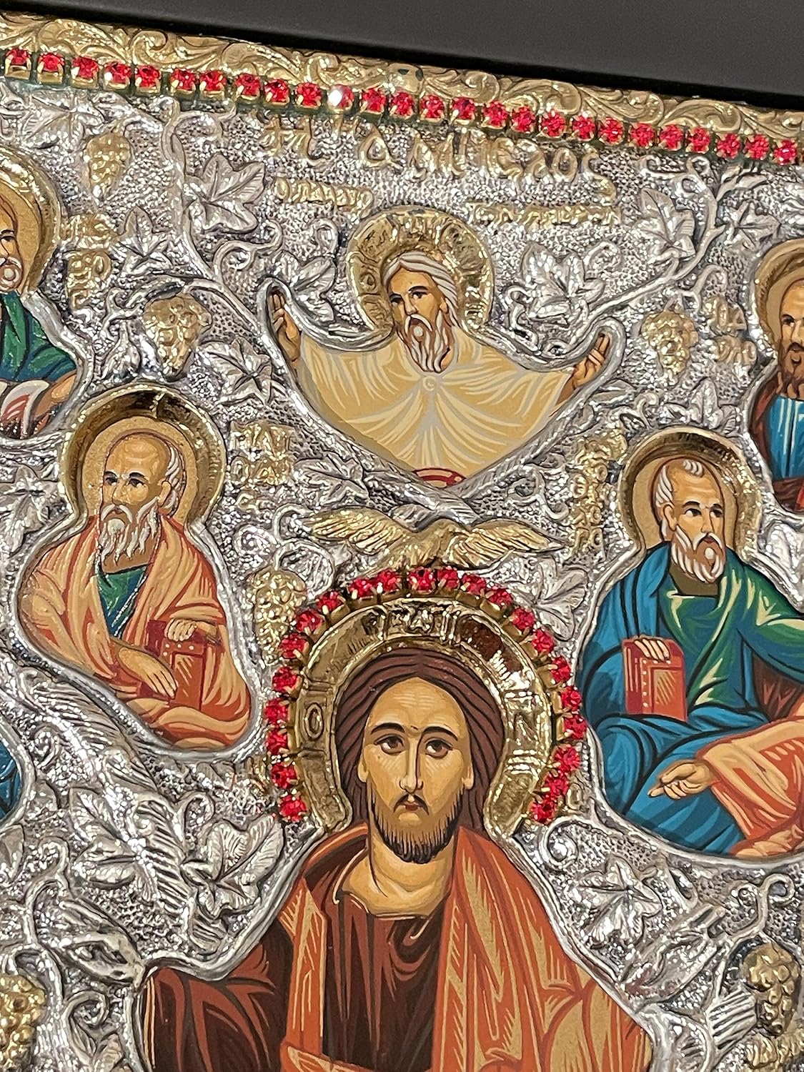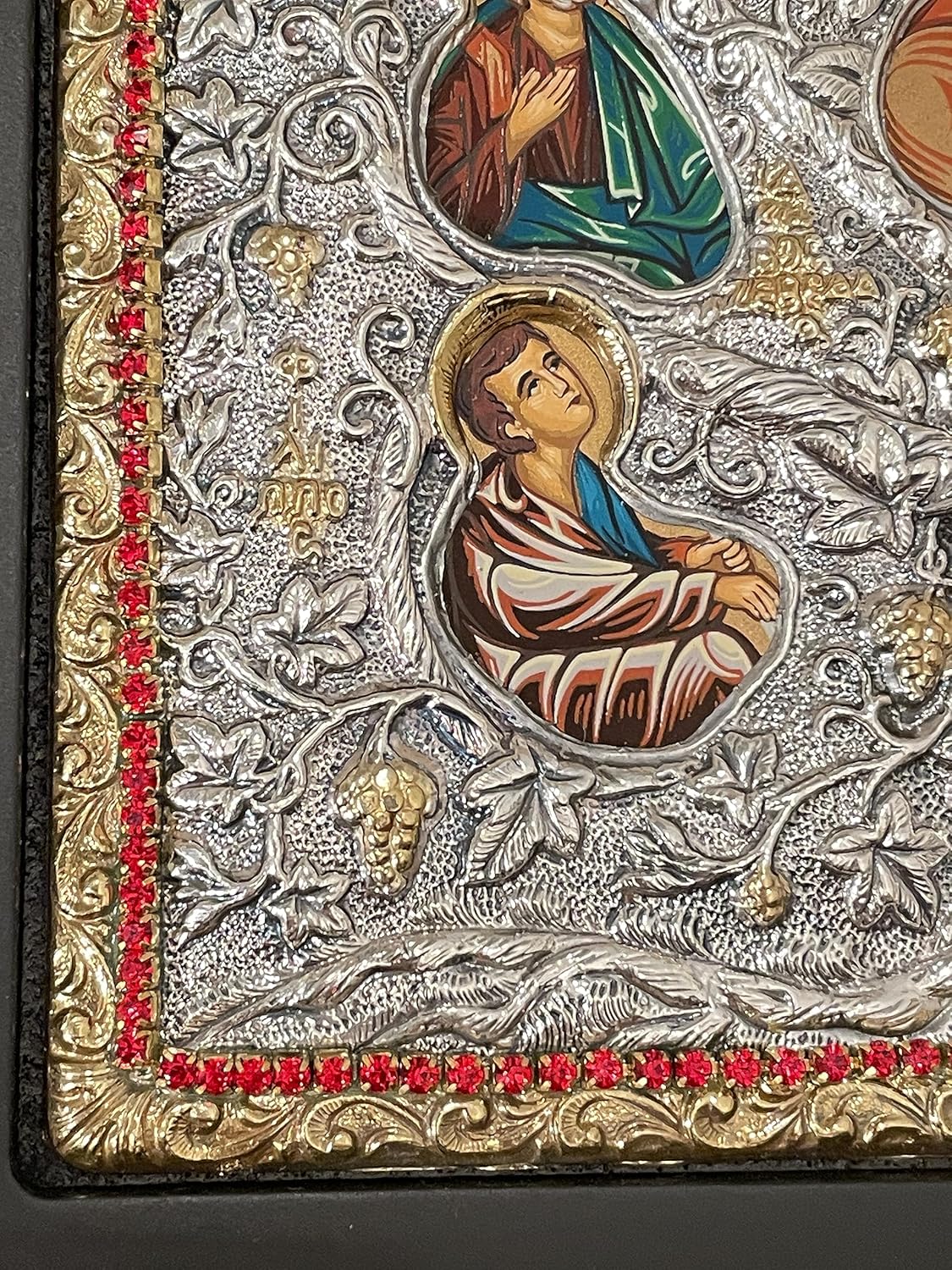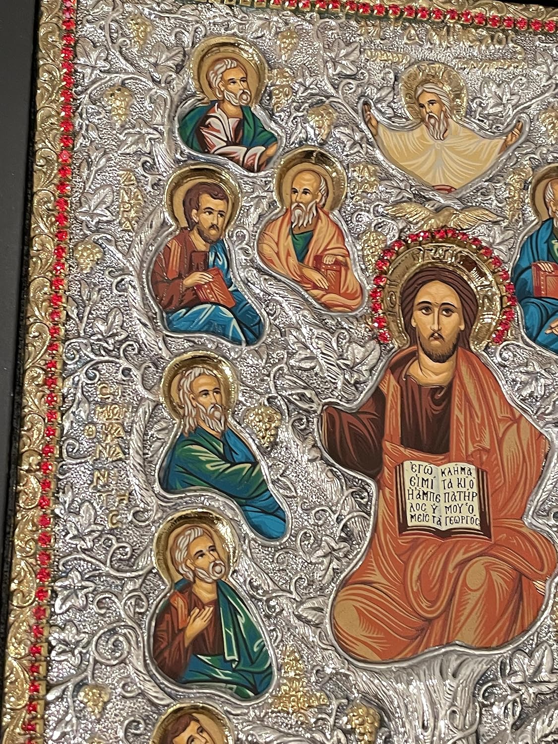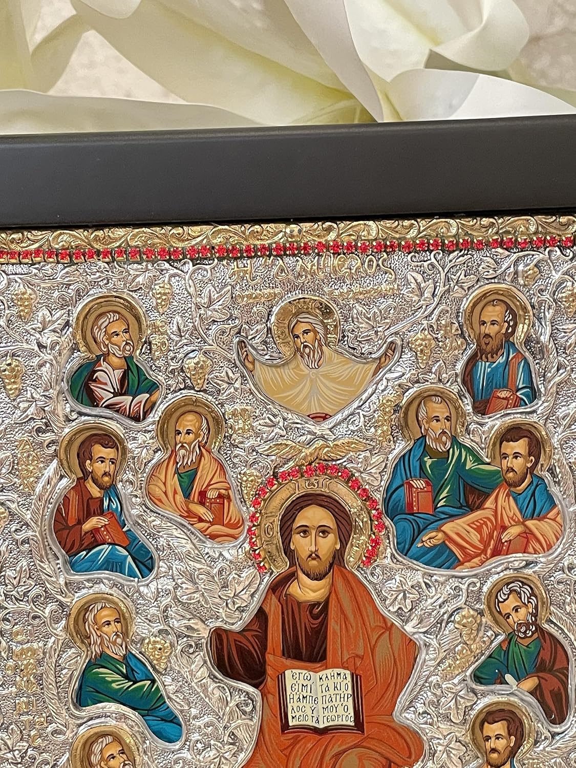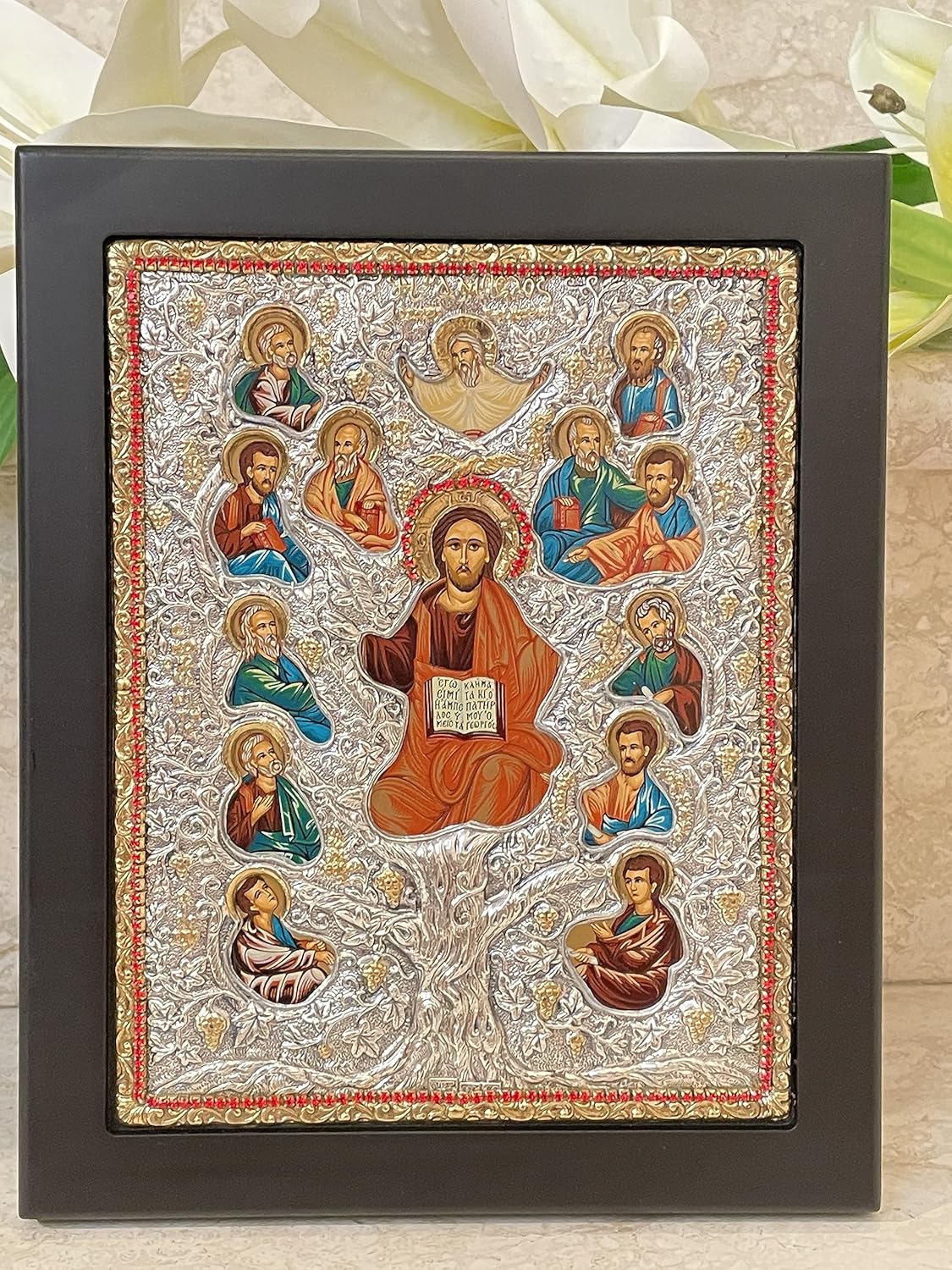 Solid Sterling SILVER Icon Tree of Life Jesus Christ the Twelve Apostles Icon Vintage Hallmarked Christian ICON Russian Greek Orthodox Icon SOLID Sterling SILVER 925 Orthodox Christianity gift HANDMADE By Master Silver Smiths Hand Carved Handpainted with 24k GOLD HANDSET 350 Austrian Crystal Gem DIAMONDS & RUBIES HANDSET. Jesus Icon Orthodox. Christian Blessing gift for someone special in your life