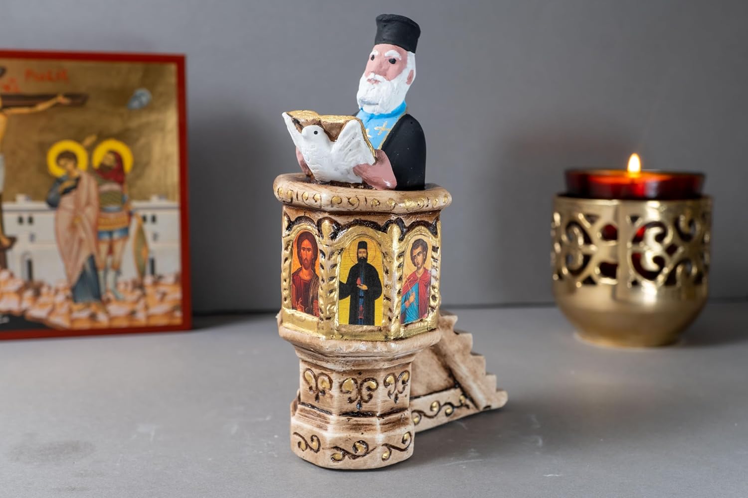 A stunning plaster figure depicting an Orthodox priest reading the Gospel from a church pulpit, meticulously painted with indelible organic colors for lifelike detail.
