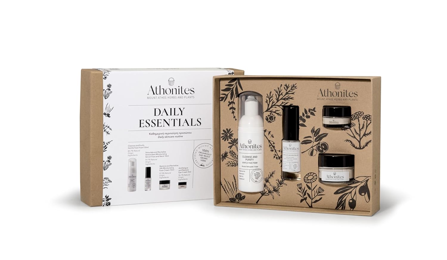 Athonites Daily Essentials Kit – Limited Edition with Cleansing Foam, Antioxidant Serum, Moisturizing Cream, Eye Cream – Natural Ingredients, Ideal Care Package for Loved Ones