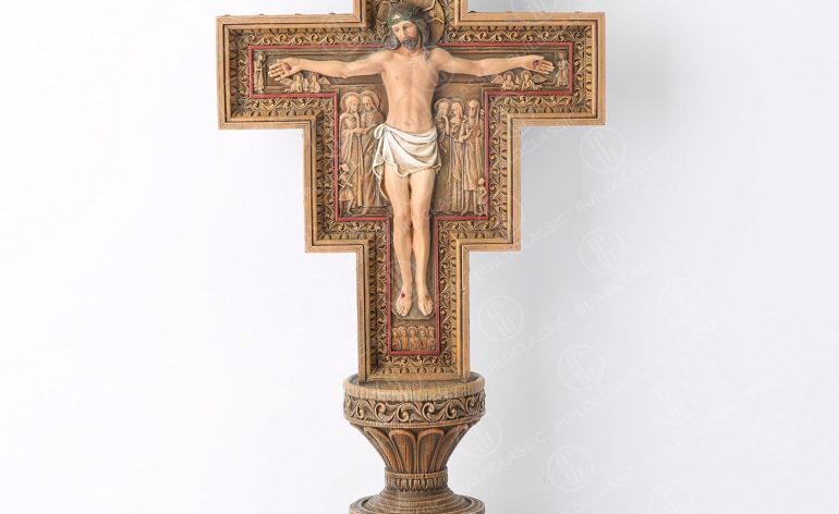 BC Catholic San Damiano Crucifix Standing Cross for Altar, Jesus Christ Home Decor, Religious Gift, Wood Carve Looking, 17.9″ H Renaissance Sculpture Hand painted by Buildclassic