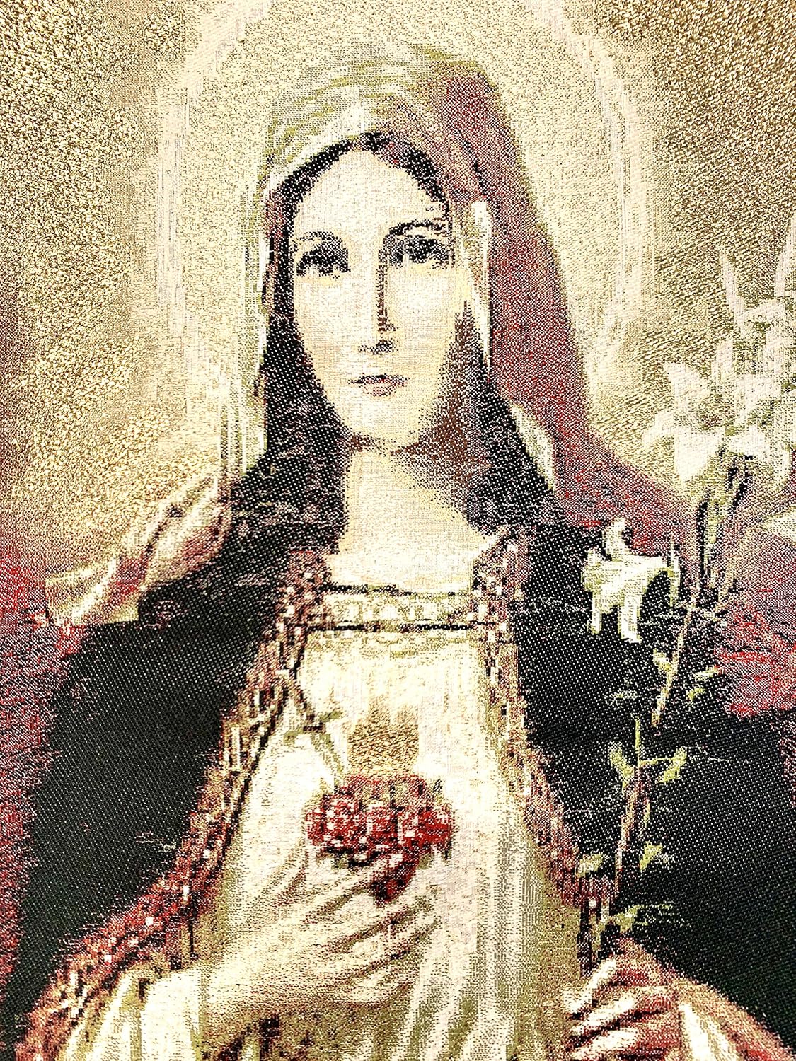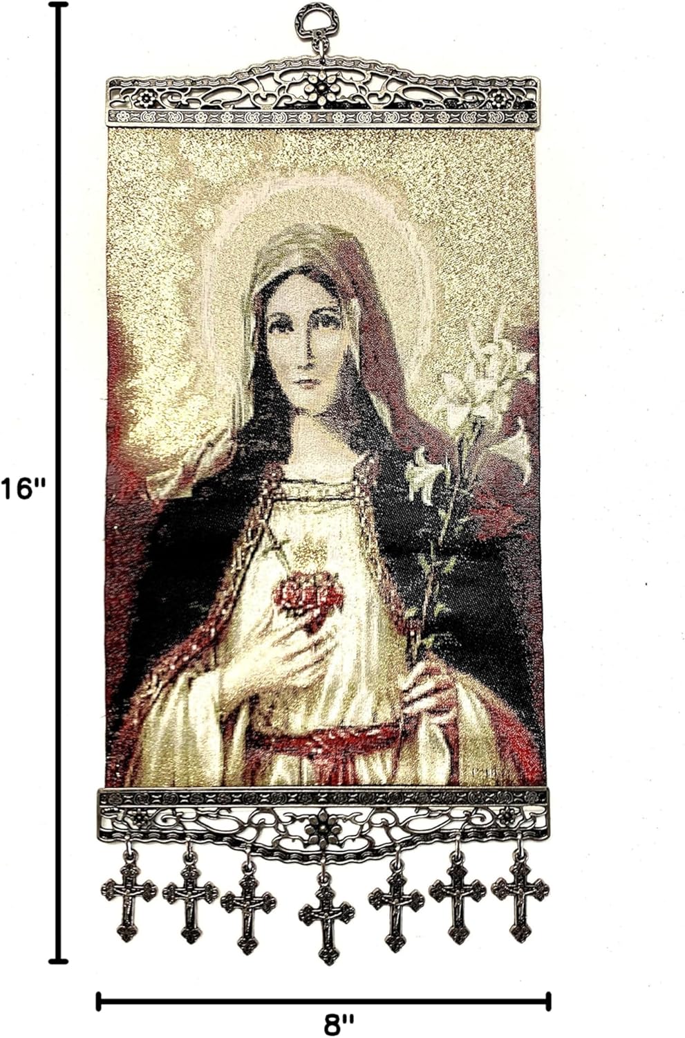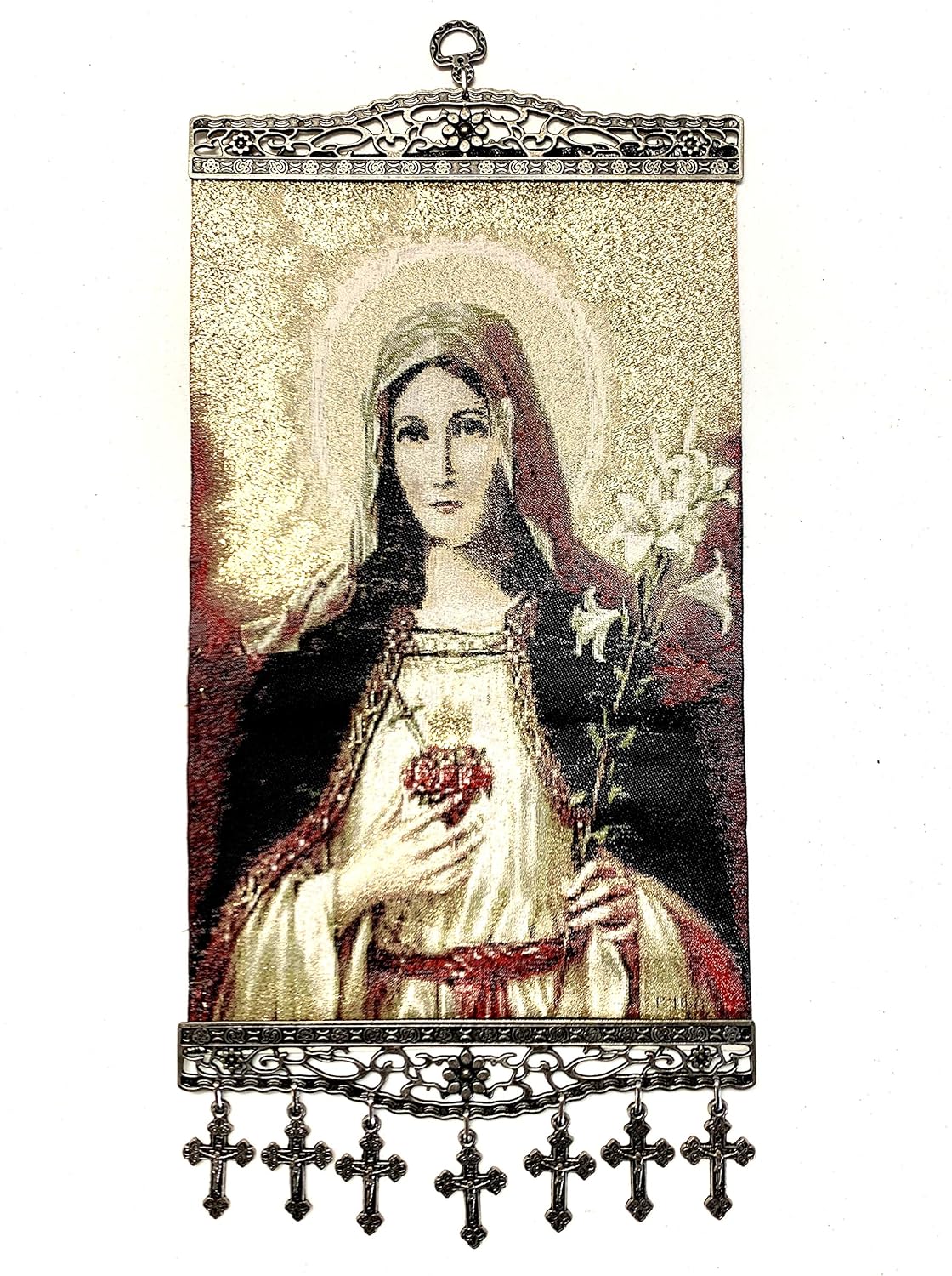 One of a kind unique religious Icon, Holy Saint Mary Blessed Virgin, Sacred Heart, Wowen Tapestry Icon With Metal Crosses Featuring Blessed Virgin Mary, Perfect Home Decor for Entire House or Office Spaces