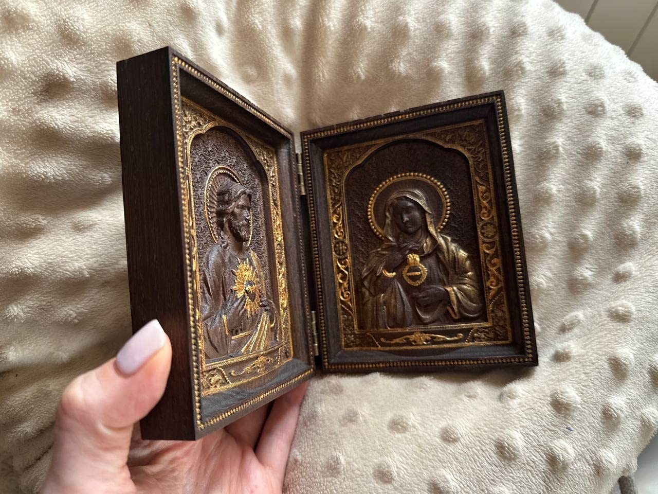 Introducing our exquisite Sacred Heart of Jesus and Immaculate Heart of Mary Wood Carved Catholic Icon, a masterpiece of religious wall hanging artwork that evokes a profound sense of spirituality and reverence. Crafted meticulously in our family workshop, each piece is made from solid wood, ensuring durability and a timeless aesthetic. This icon is not merely a decoration but a meaningful gift, perfect for those who hold the Sacred Heart of Jesus and Immaculate Heart of Mary close to their own hearts. Whether as a cherished addition to your home sign wall decor or as a thoughtful present for a mom birthday or friend birthday, this piece resonates on a deeply personal level. Our Sacred Heart of Jesus and Immaculate Heart of Mary icon is available in a custom size and offers a choice of 7 vibrant colors, allowing you to personalize it to match your home or sacred space. To make it even more special, we offer free personal engraving, turning each icon into a unique keepsake. The intricate hand-painted details highlight the sacred heart, capturing the essence of Christian art and making it a centerpiece for any collection of orthodox icons or religious coins. This wood carving serves as a beautiful expression of faith, suitable for use as framed wall art or as part of decor during significant cultural celebrations such as the Dia de los Muertos altar. It harmonizes well with altar de muertos decorations, offering a serene presence that complements the solemnity of the occasion. Furthermore, the Sacred Heart of Jesus and Immaculate Heart of Mary icon can be an integral part of prayer spaces, alongside items like the serenity prayer coin, prayer cross, or bible bookmark, enhancing your spiritual practice. Handmade in Ukraine with dedication and skill, our icon is a testament to traditional craftsmanship, echoing the serenity and devotion embodied in the serenity prayer and Sacred Heart of Jesus and Immaculate Heart of Mary prayer card. This piece is not only an artistic triumph but a spiritual companion, offering comfort and inspiration in equal measure. Embrace the divine with our Sacred Heart of Jesus and Immaculate Heart of Mary Wood Carved Catholic Icon—a true embodiment of faith, love, and artistry.