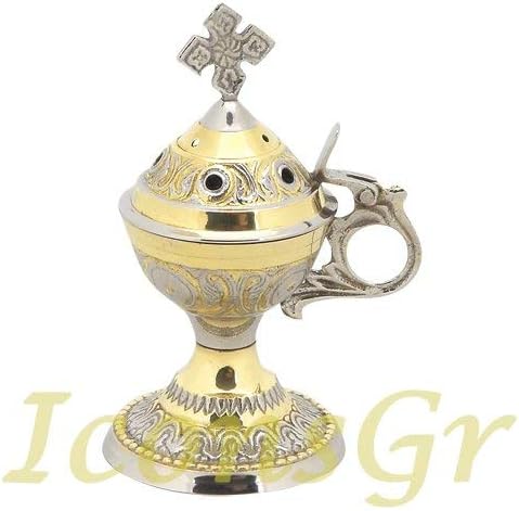 Christian Orthodox Censer Dimensions : Height : 14 cm 5.51 in christian censer in Gold/Nickel color Description: Censers are vessels made for burning incense. These vessels vary greatly in size, form, and material of construction. They may consist of simple earthenware bowls or fire pots to intricately carved silver or gold vessels, small table top objects a few centimetres tall to as many as several metres high. In many cultures, burning incense has spiritual and religious connotations, and this influences the design and decoration of the censer.