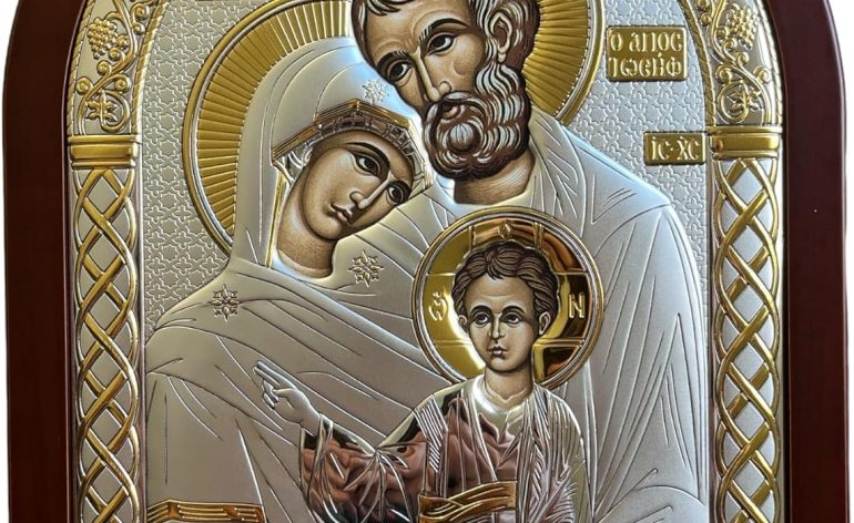(A-6/005G/K) Holy Family Byzantine Silver Christian Icon/Greek Handmade (red, 11×8)