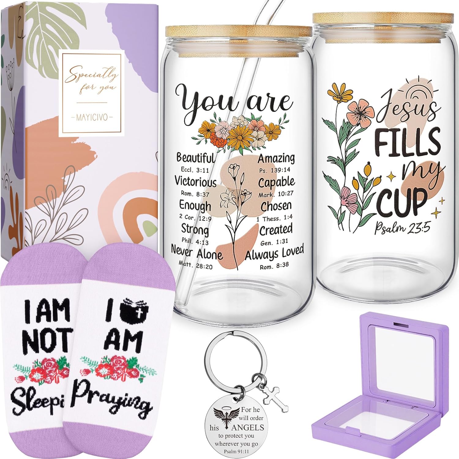 CHIC CAN GASS CUP GIFT SET: MAYICIVO Religious Christian Gifts for Women, full of so much inspirational & uplifting items, also ideal as bible gifts, faith based gift, baptism gifts, and christian gifts for women on Mothers day, Graduation, Retirement, Valentines Day, Thanksgiving, Christmas, etc. Get one religious gifts for women.