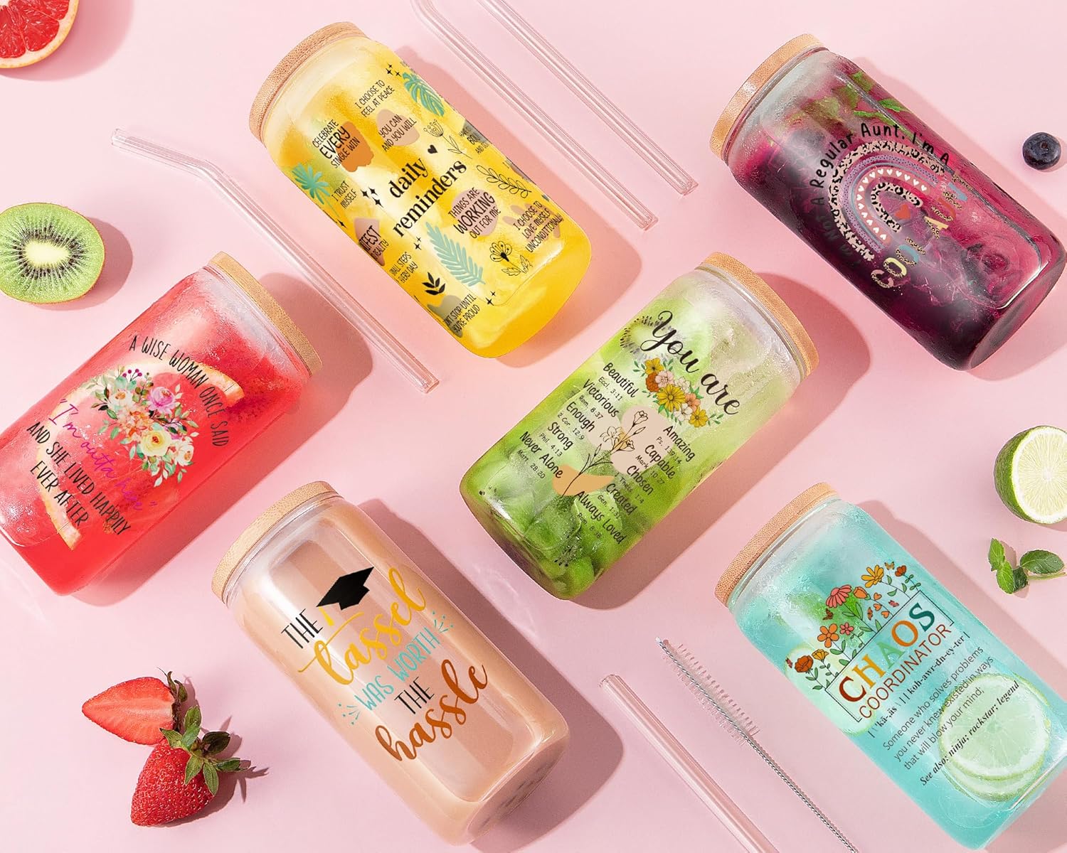PORTABLE & VERSATILE GLASS TUMBLER: The reusable can glass coffee cup in our religious gifts perfectly fit in hand or standard car cup holders, portable for work, travel, picnic, camping, etc; Serves and allows for a beautiful display for all beverages, like coffee, tea, water, beer, milk, juice, soda, smoothies, milkshakes, wine, whisky, cocktails, bubble tea, etc. Show surprising visual color presentation for her & leave her ultimate beverage experience with this cute can glass gifts set.