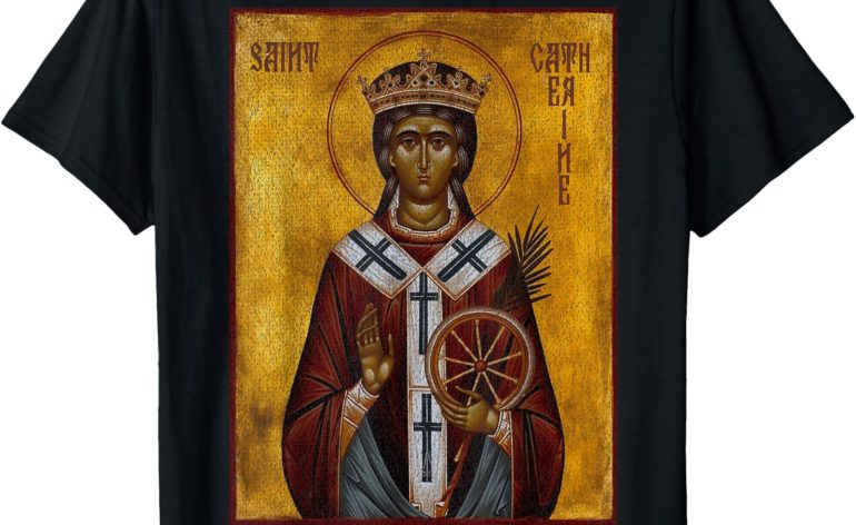 This Retro St. Catherine of Alexandria Eastern Orthodox Icon t-shirt is the perfect shirt for those in the Greek and Russian Eastern Orthodox religion, Catholics, to wear at youth camp, services, ministry, concerts, and Greek Festivals! Christmas too! A learned martyr and patroness of philosophers and students. Saint Catherine of Alexandria, a 4th-century martyr, is venerated on November 25 as one of the most courageous saints in the Eastern Orthodox Church. she was martyred on a spiked wheel, which miraculously broke, and later beheaded. Saint Catherine is often depicted with a crown, a wheel, and a palm branch, symbolizing her royal lineage, martyrdom, and victory in Christ. She is celebrated on November 25 and is the patron saint of scholars, philosophers, and students Perfect for mass, service, and more!