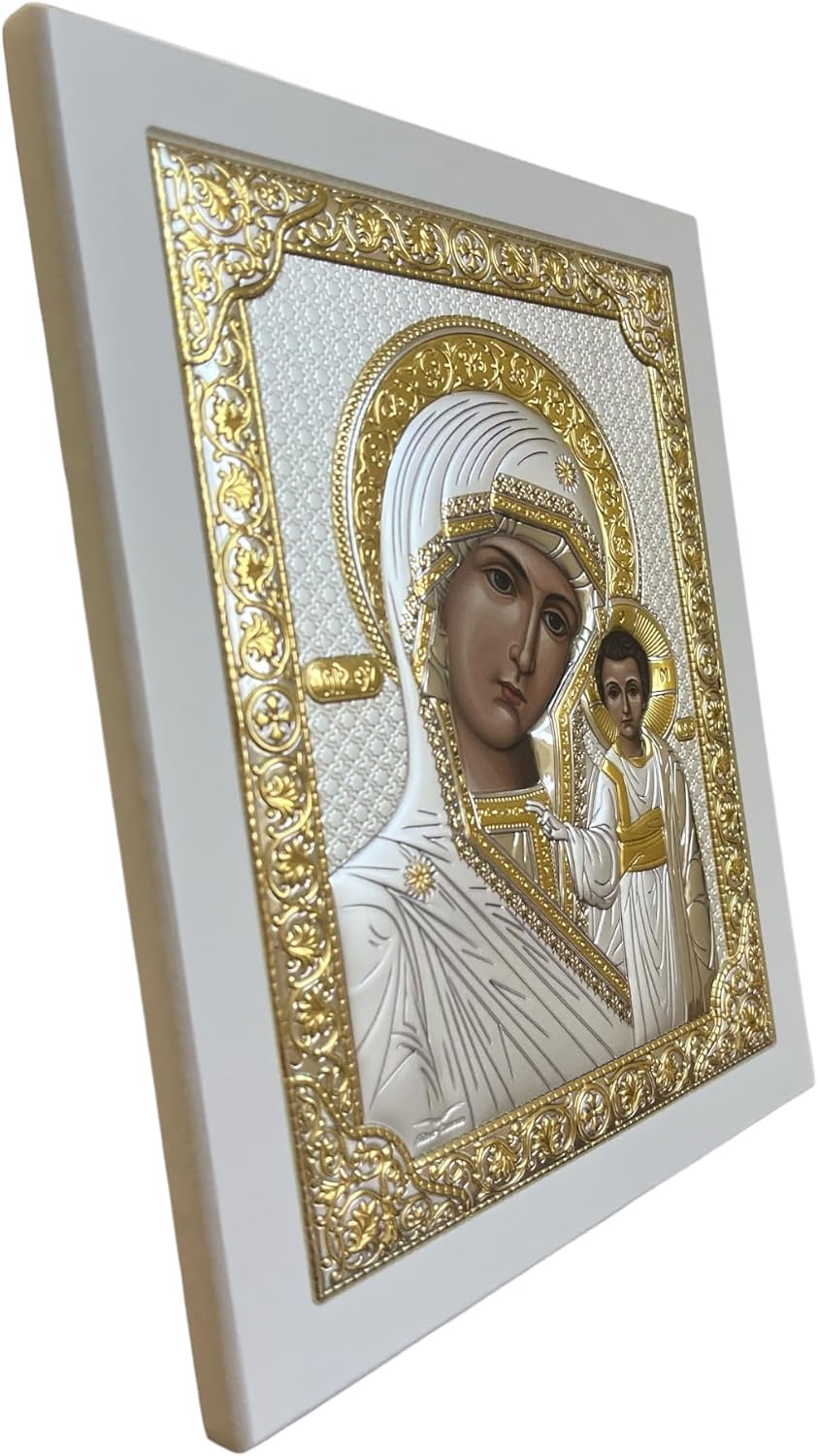 Silver Canvas (PR-5/002G/B) Virgin Mary of Kazan Kazanskaya Byzantine Silver Orthodox Icon/Greek Handmade (White, 9 1/2 x 7 1/4)