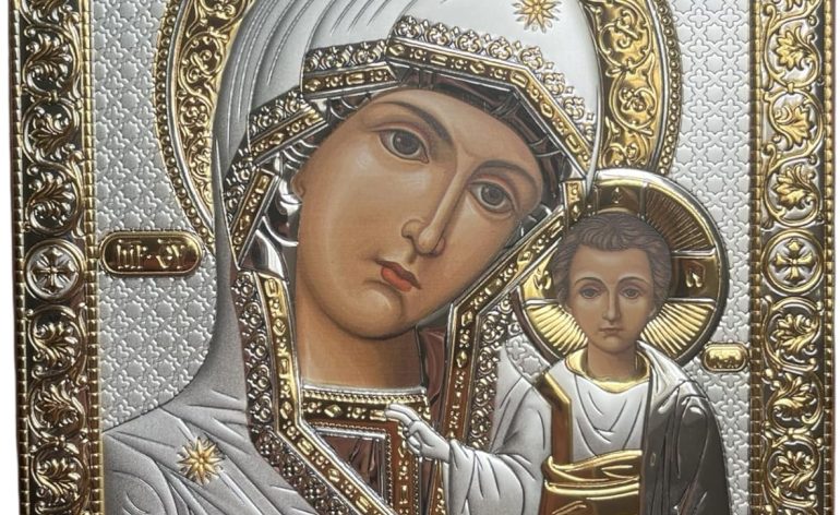 Silver Canvas (P-6/002G/K) Virgin Mary of Kazan Kazanskaya Byzantine Silver Orthodox Christian Icon/Greek Handmade (9 x 7)
